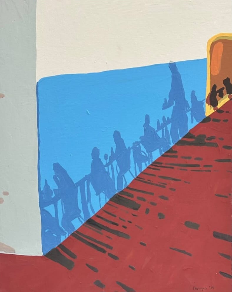 Parto sempre da fotografie reali: non inventc soggetti immaginari, ma scelgo scorci e situazioni vissute, riportandole nel mio stile. Cosi luce. ombra, colore e presenza umana si intrecciano, raccontando un mondo che è insieme reale e immaginario.